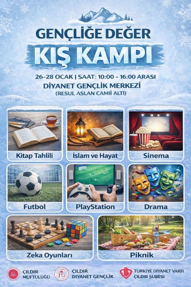 Çıldır Müftülüğü, gençlerin hem eğleneceği hem de faydalı vakit geçireceği “Gençliğe Değer Kış Kampı” ile yeni döneme merhaba dedi. Bugün itibarıyla kapılarını açan 3 günlük gündüzlü kamp, 10-15 yaş arası gençleri ağırlıyor. 26-28 Ocak 2026 tarihleri arasında, her gün saat 10:00-16:00 arasında düzenlenecek etkinlikler büyük ilgi görüyor.Diyanet Gençlik Merkezi’nde gerçekleşen kampta gençler;Sıcacık çay muhabbetleri, Keyifli kitap tahlilleri, Coşkulu futbol karşılaşmaları, Rahatlatıcı sinema seansları, Eğlenceli PlayStation oyunları Ve birbirinden sürpriz etkinliklerle dolu bir programla buluşuyor.Çıldır Müftülüğü Gençlik Koordinatörlüğü, “Gençlerimizin hem manevi hem de sosyal gelişimine katkı sunmayı amaçlıyoruz. Kış tatilini en güzel şekilde değerlendirmek isteyen tüm genç kardeşlerimizi bekliyoruz” açıklamasında bulundu.