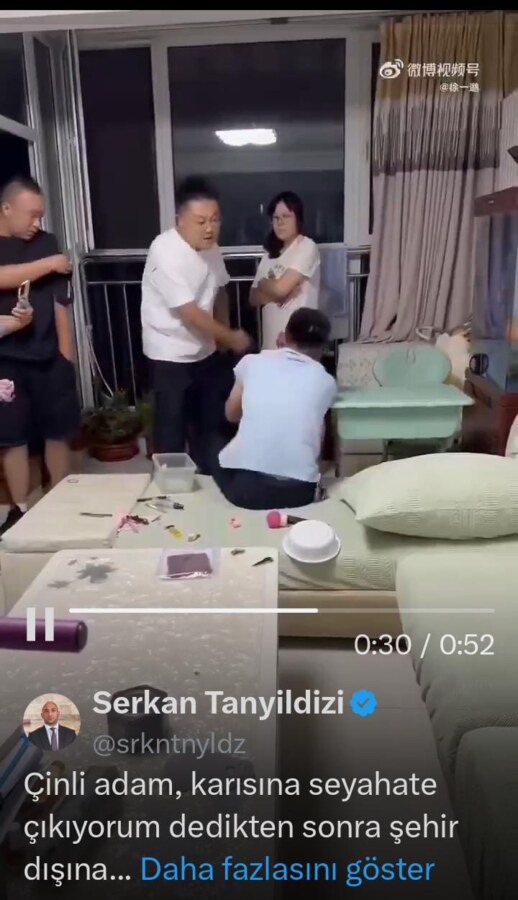 ‘Çinli adam, karısına seyahate çıkıyorum dedikten sonra şehir dışına gitmek yerine ailesiyle birlikte eve döndü ve eşini kendi arkadaşıyla yatakta aldatırken yakaladı. Polisin gelmesi ve çekilen videoların sosyal medyada viral olmasından sonra kadın aldatmasının sebebini, kocasının onu tatmin etmemesi olarak açıkladı…’