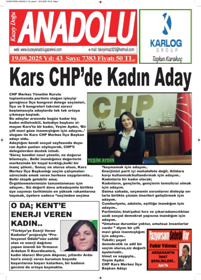 Çünkü kalp kalbe karşı dedikleri sözü doğrulayan ama kendisini anlatan, iyi bir niyetle kendisine moral versin diyen ve kendisinin hiç haber olmadan yapılan, yazılan ‘Kars CHP’de kadın aday’ manşetli gazetemi sanal sayfasında bile paylaşmadığını görüp, üzüldüğüm ve biz Ardahanlıların Kars’tan neden ayrıldığımızı adeta bir kez daha teyit eden Karslının bu tutumuna üzüldüğüm ama gazeteci ustalarımız dediklerimizin birinin kızı olduğundan değil, bir kadının siyasette yer almasına olan desteğimiz adına tüm kalp sıcaklığıyla haber yapmış olduğumu anlıyordum..