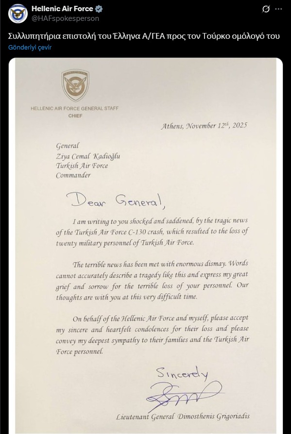 Çünkü ülkemize düşen kara haberin hemen ardından, ‘bizim’ denen ama Yunanistan’ın çaktırmadan sahiplendiği söylenen Ege adalarında tatil yapmakla övünen hatta ‘Yunanistan’da ev aldık..’ diye bol selfiler çektiğimiz Yunan Hava Kuvvetleri, X hesabından yapılan paylaşımda, “Günün fotoğrafı” ifadeleriyle Yunanistan’da ki C-130 tabut, pardon nakliye uçaklarının fotoğraflarını paylaşmıştı.