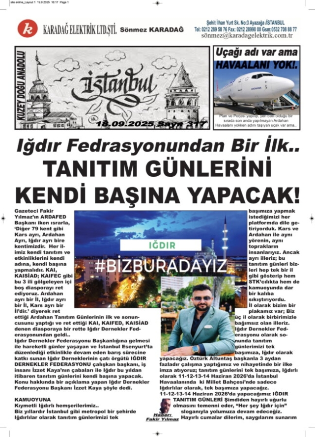 Tabi bu arada bir dönem değil, 2 dönemden çok başında olduğum sırada ilk, son olan Ardahan’ı Tanıtım Günlerinin yine tek başına yapışılmayacağı, yapılanında içinde ARDAFED’in olmadığı Ardahan adını gölgeleyen başka bir stk ile Kars-Ardahan olarak yapılacağını ama Iğdır Federasyonun bu etkinliği, ‘Kars ayrı, Ardahan ayrı, Iğdır ayrı’ diyerek KAI, KAIFED, KAISİAD denen içi boş diasporalara katılmadığı ve tek başına, ‘Iğdır Tanıtım Günleri’ yapacağını da öğrenip, 5 Ekim’de İstanbul Kartal Aydos’ta yapacağımız düğün ile dünya evine girecek olan Gazeteci Özlem Şeyma Yılmaz ile birlikte Tempo TV’de canlı olarak yayınladığımız, ‘Gazetecilerle Gündem’ programımıza kadın kolları başkanı ile katılıp, orada söylediği sözünü tuttuğu için Iğdır Federasyon Başkanı İzzet Kaya’yı da arayıp kutluyorum.