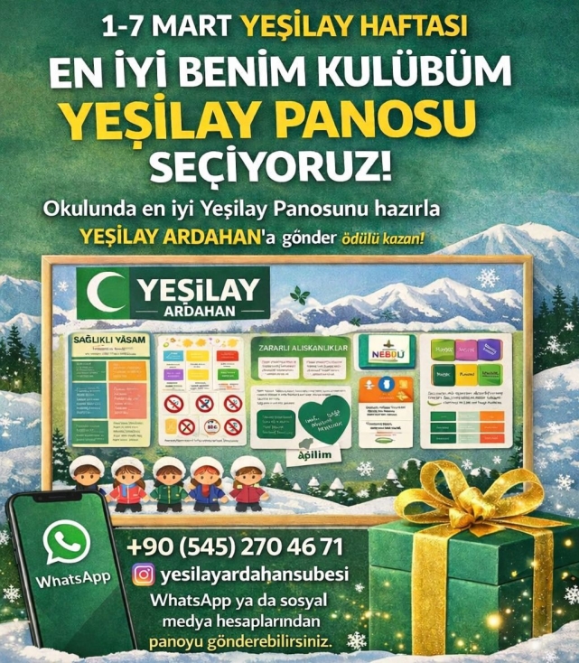 Yeşilay Ardahan Şubesi, 1-7 Mart Yeşilay Haftası kapsamında “En İyi Benim Kulübüm Yeşilay Panosu” yarışması düzenliyor.Yarışmayla amaç; gençlerde sağlıklı yaşam bilincini güçlendirmek, bağımlılıklara karşı farkındalık oluşturmak ve Yeşilay ruhunu okullarda yaşatmak olarak açıklandı.Okullarda sağlıklı yaşamı ve bağımlılıklarla mücadeleyi anlatan, en yaratıcı Yeşilay panosunu hazırlayan öğrenciler ve okullar ödül kazanma fırsatı elde edecek.Hazırlanan panoların fotoğrafları 0545 270 46 71 numaralı telefon veya @yesilayardahansubesi sosyal medya hesabı üzerinden Yeşilay Ardahan Şubesi’ne gönderilebilecek.Yeşilay Ardahan Şubesi, “Haydi Ardahan! Sağlıklı gelecek için birlikte üretelim, birlikte farkındalık oluşturalım” çağrısında bulundu.